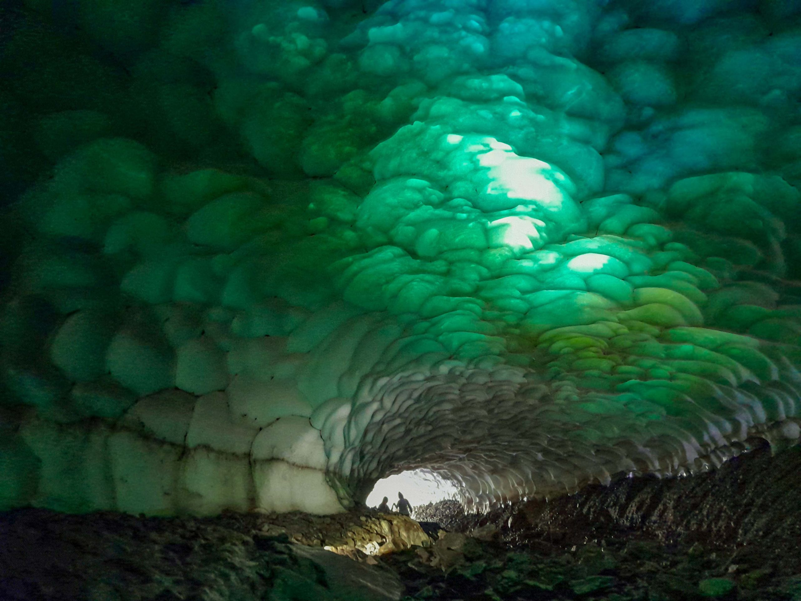 La acumulación de nieve durante el invierno se convierte en hielo, que se derrite desde la base creando túneles. Estos pasadizos de hielo, donde la luz y los colores generan un espectáculo visual único.